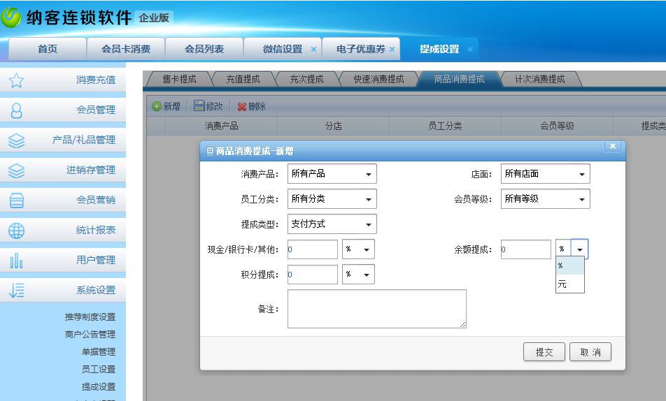 1.可以根據(jù)開卡、充值、消費等進行提成