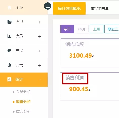 在【統(tǒng)計(jì)】→【銷售分析】→【每日消費(fèi)概覽】界面中,優(yōu)化后的銷售利潤,不統(tǒng)計(jì)會(huì)員計(jì)次消費(fèi)。