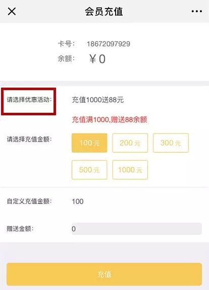 會(huì)員在微信端充值,可以選擇優(yōu)惠活動(dòng),并且支持等充值規(guī)則。