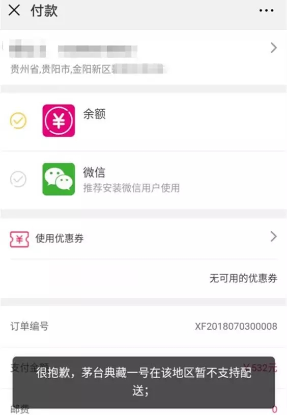 更新前,用戶在微商城中填寫(xiě)訂單界面填寫(xiě)的貴州地區(qū),系統(tǒng)顯示該地區(qū)不支持配送;更新后,這樣的bug不再存在。