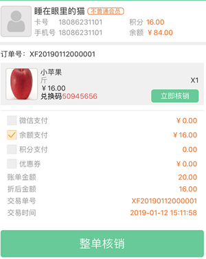 會員到店自提的產品提走時,即可點擊立即核銷進行,如果該會員購買了多樣產品,但本次只自提部分產品,即可核銷需要提走的幾樣產品,剩下的訂單可以留著下次提取,也可以將整單產品全部自提。這種模式也是為了方便客戶靈活提貨,同時也方便商家記錄客戶提貨記錄。