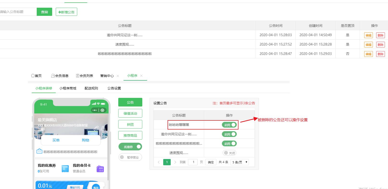 2.小程序裝修---現(xiàn)在被刪除的公告前后臺都展示了,被刪除的公告在小程序裝修頁面和微信小程序(前臺)應(yīng)該都不能再展示了;