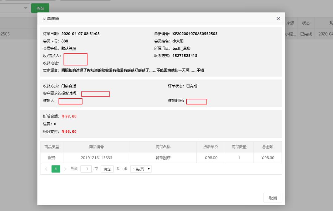 5.訂單中心---商城訂單中,顧客購買了服務(wù)類商品,需要到店服務(wù)時,訂單詳情顯示的內(nèi)容有問題;