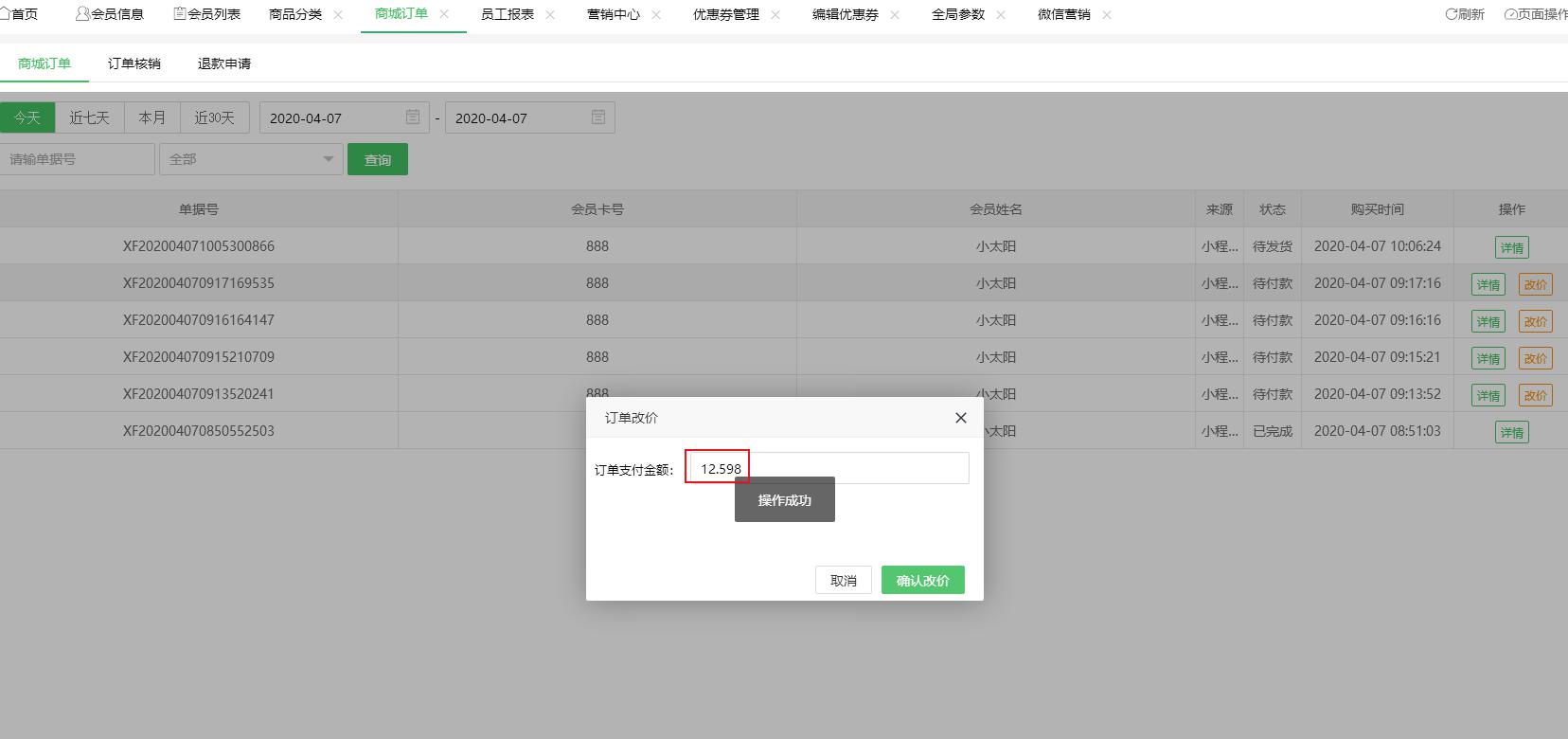 6.商城訂單---訂單改價,修改的價格可以是小數(shù)點后三位數(shù),訂單金額調(diào)整為最多支持到兩位的;