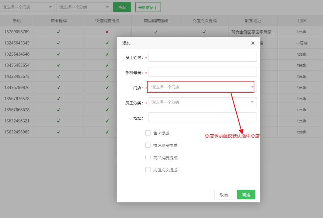 7.新增員工---連鎖分店的管理登錄到后臺,新增員工時,系統(tǒng)默認(rèn)選擇是當(dāng)前門店;