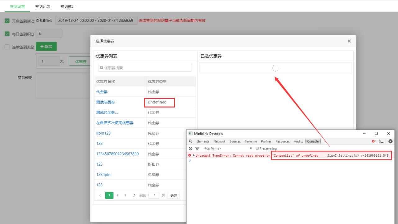 9.簽到設(shè)置---設(shè)置連續(xù)簽到獎勵,選擇優(yōu)惠券時,設(shè)置積分界面出錯;