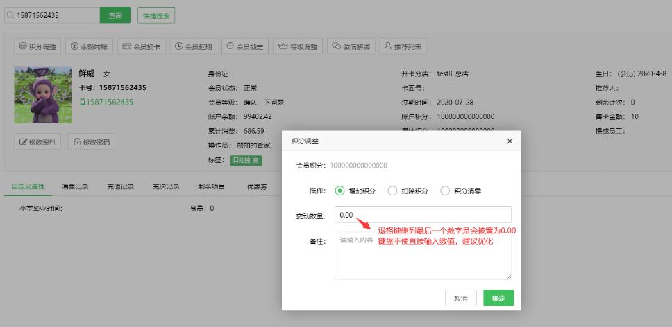 12.積分變動---文本框的初始積分?jǐn)?shù)額為0.00,需要手動先刪除,鍵盤輸入時不便于直接輸入數(shù)值,本次優(yōu)化去除小數(shù)點后的.00,直接輸入積分?jǐn)?shù)值;
